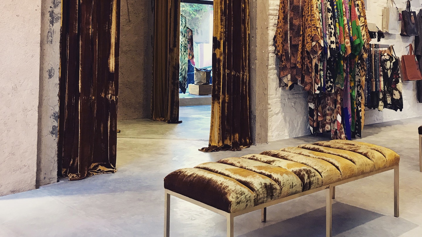 Algerian–French designer Norya owns a small boutique nestled beneath the leafy canopy of a trendy café. Although her shop is petite, Norya’s designs have draped some of the world’s biggest celebrities (such as Kate Moss, Erykah Badu, and Sharon Stone). She sits on the sun-drenched patio of her boutique, wearing one of her iconic silk kaftans in splendid dandelion yellow.