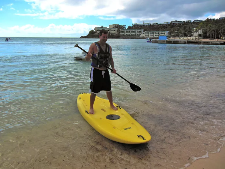 The need for the latter becomes apparent as I set off from the Bolongo Bay Beach Resort in St. Thomas, U.S.V.I. for my first attempt at standup paddleboarding. My instructors, Dave Tracy and Yoshi Tochiki, offered crucial tips, primarily: hold the paddle with two hands, one on top and one on the shaft for the best leverage; and stand in the middle of the board with your feet shoulder-width apart and aligned with your shoulders. (Of course, starting out on your knees until you build confidence is perfectly fine.)