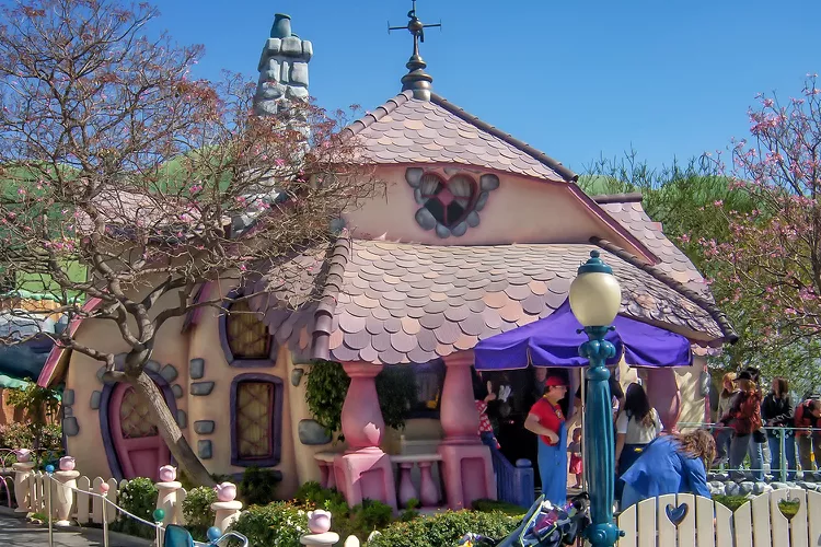 Minnie’s House in Toontown looks just like what you might imagine the world’s most famous mouse girl’s house would look like, a cute pink and lavender bungalow. The adorable fest starts at the heart-shaped gate set into a pink picket fence. Look for the heart-shaped windows and the bow on the mailbox.