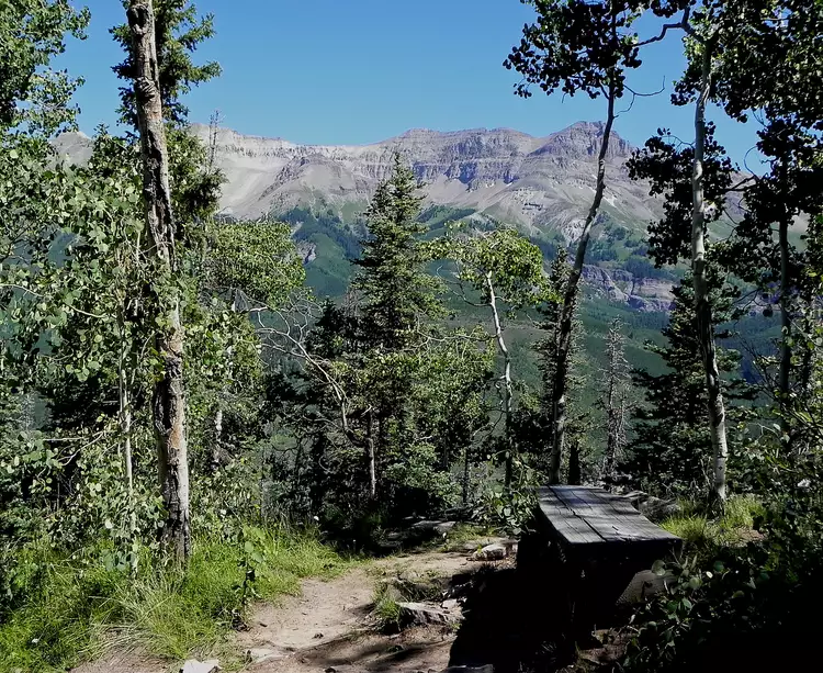 As I hiked on the Ridge Trail at Telluride, the only sounds were the clacking of cicadas, the shrill tweets of unidentified birds, and the gentle rustle of aspen leaves swaying in the wind. Pockets of sunlight peeked through the dense pines, illuminating vibrant purple flowers at my feet and patches of green lichen on fallen logs. A distant view through the towering trees revealed sheer, striated cliff bands still capped by snow, even in July.