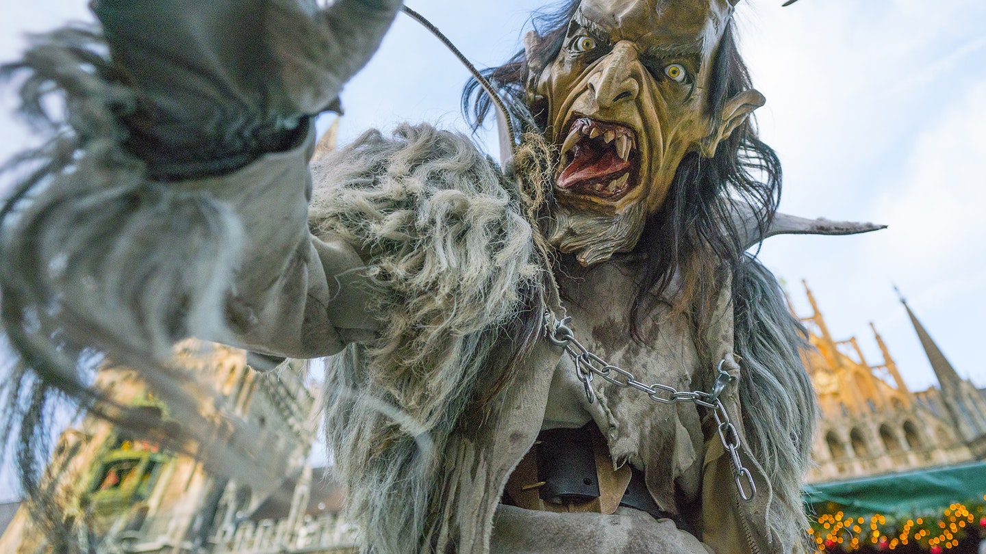 Suddenly, a cacophony of clanking overpowers the holiday tunes. Heads turn and people point, and I feel a heavy hand ruffle my hair. Turning around I’m face-to-grotesque-face with a forked tongue sticking out of a fanged mouth and curling ram’s horns jutting from its demonic forehead. Today in Munich, this frightening sight is as much a part of Christmas as Saint Nicholas. Krampus is in town, and today is his day.
