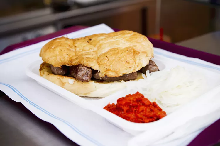 Commonly seen on menus, Ćevapi are grilled minced meat tubes, made from beef, lamb, or pork, often served with ajvar, a thick red pepper sauce, and flatbread called lepinja.
