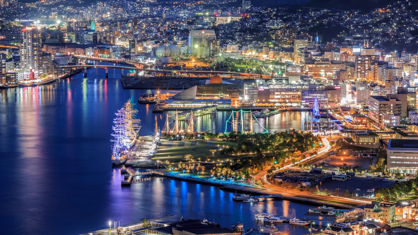 As daylight fades, taking the famous cable car to the peak of Inasa-yama provides an exceptional panoramic view of the city. Here, the captivating lights of the urban landscape contrast beautifully with the shimmering waters of the harbour.