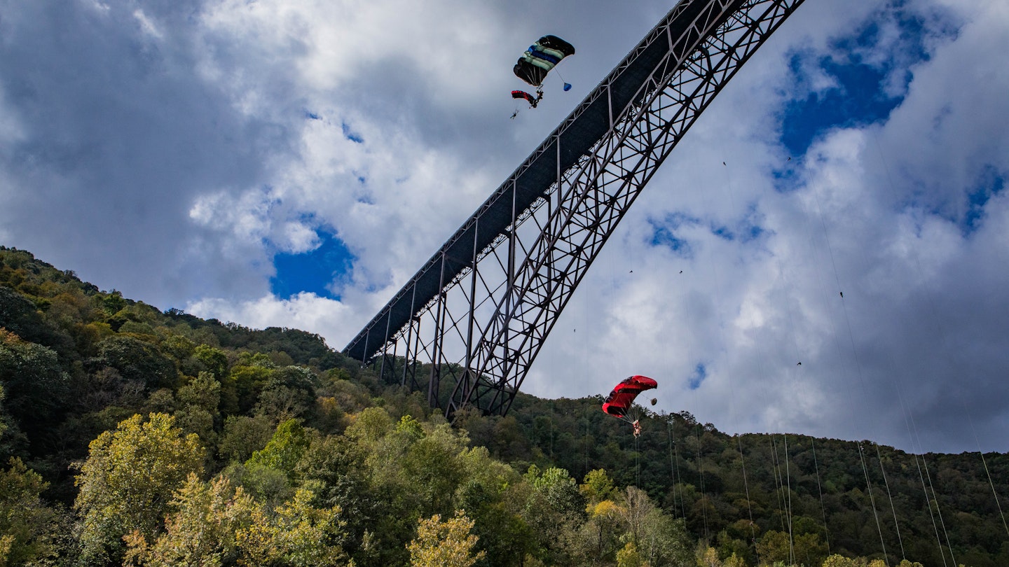 “That’s my son,” says a woman standing next to me on a chilly morning in October—the third Saturday in October to be exact. We are high atop the 876-foot-tall New River Gorge Bridge with thousands of other people gathered to watch hundreds of BASE jumpers fling themselves into the deep tree-lined canyon and toward the swift-flowing whitewater below. Her daredevil son is next in line to take a flying leap. “I could stay home, but I’d rather be here if something were to happen to him.”