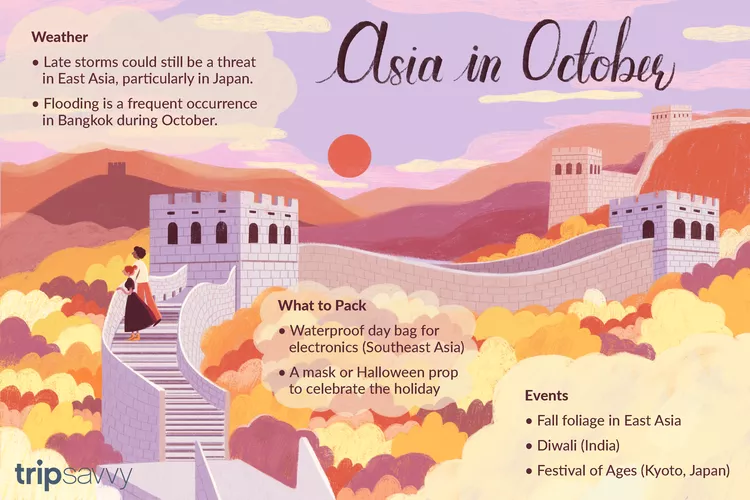 October in Asia is pleasant, as long as you’re enjoying autumn weather in East Asia rather than dealing with the monsoon rains in Southeast Asia. October is a transition period, a “shoulder” month between seasons. The Southwest Monsoon gives Thailand a final blast before beginning to clear in November. China, Japan, and other places with moderate climates will be enjoying fall colors.