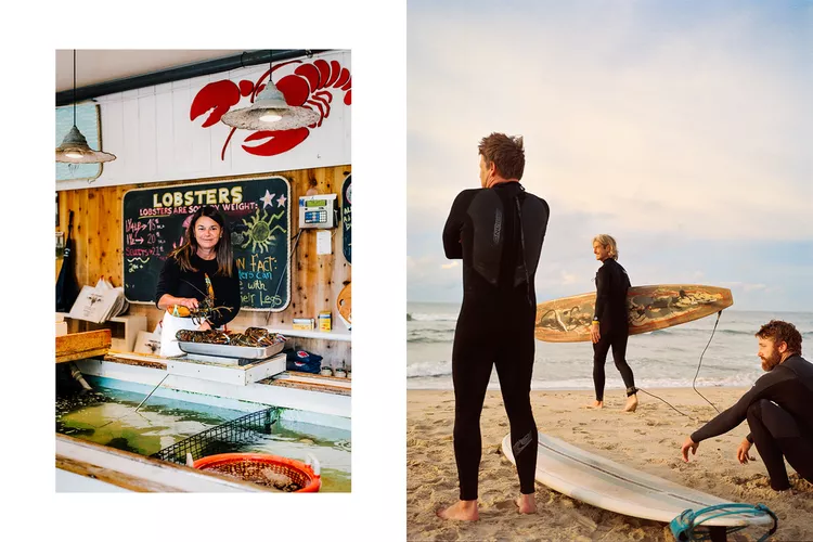From left: Fresh seafood for sale at Gosman’s; surfers gather at Montauk’s Ditch Plains on early summer mornings.