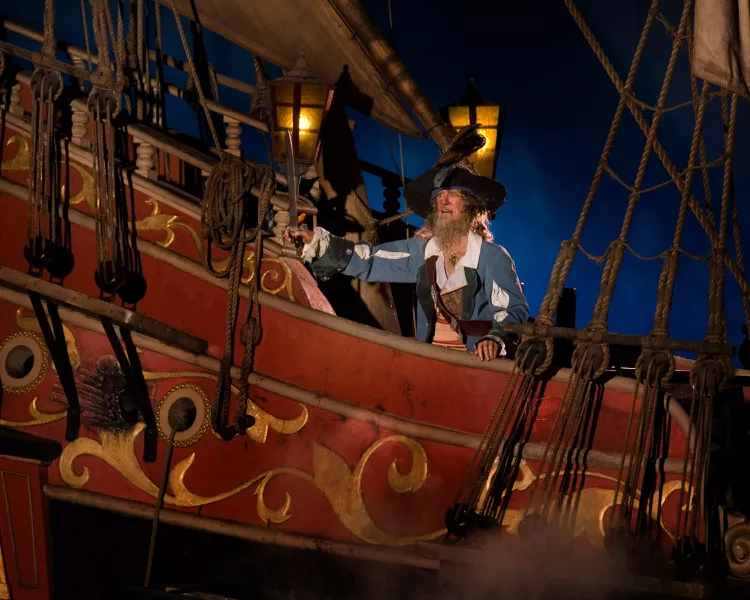 The California version of Pirates has two drops and features a creepy mist screen with a projection of Blackbeard. Nevertheless, both rides are similar from the battling ships section to the end.