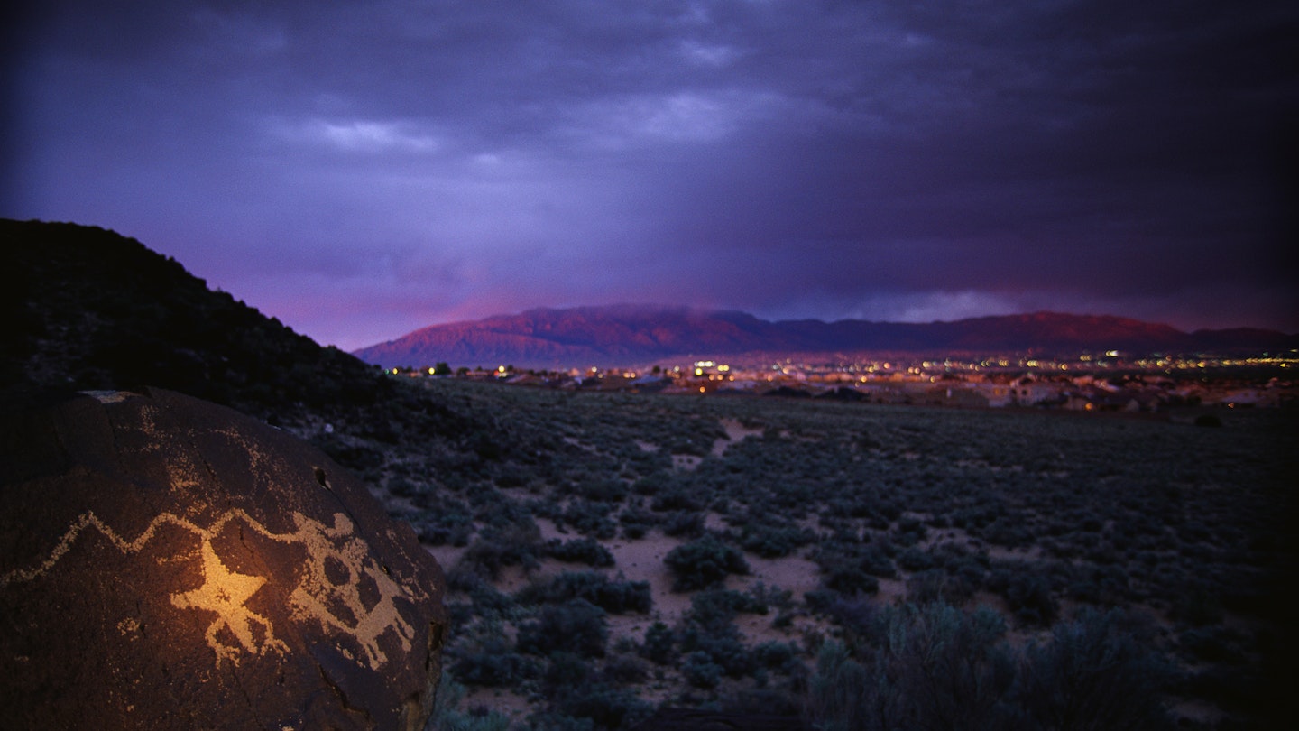 Petroglyph National Monument protects ancient stone carvings and artwork created by early peoples. These artworks were formed through methods that involved picking or abrading the darker layers of rock to reveal lighter colors beneath.