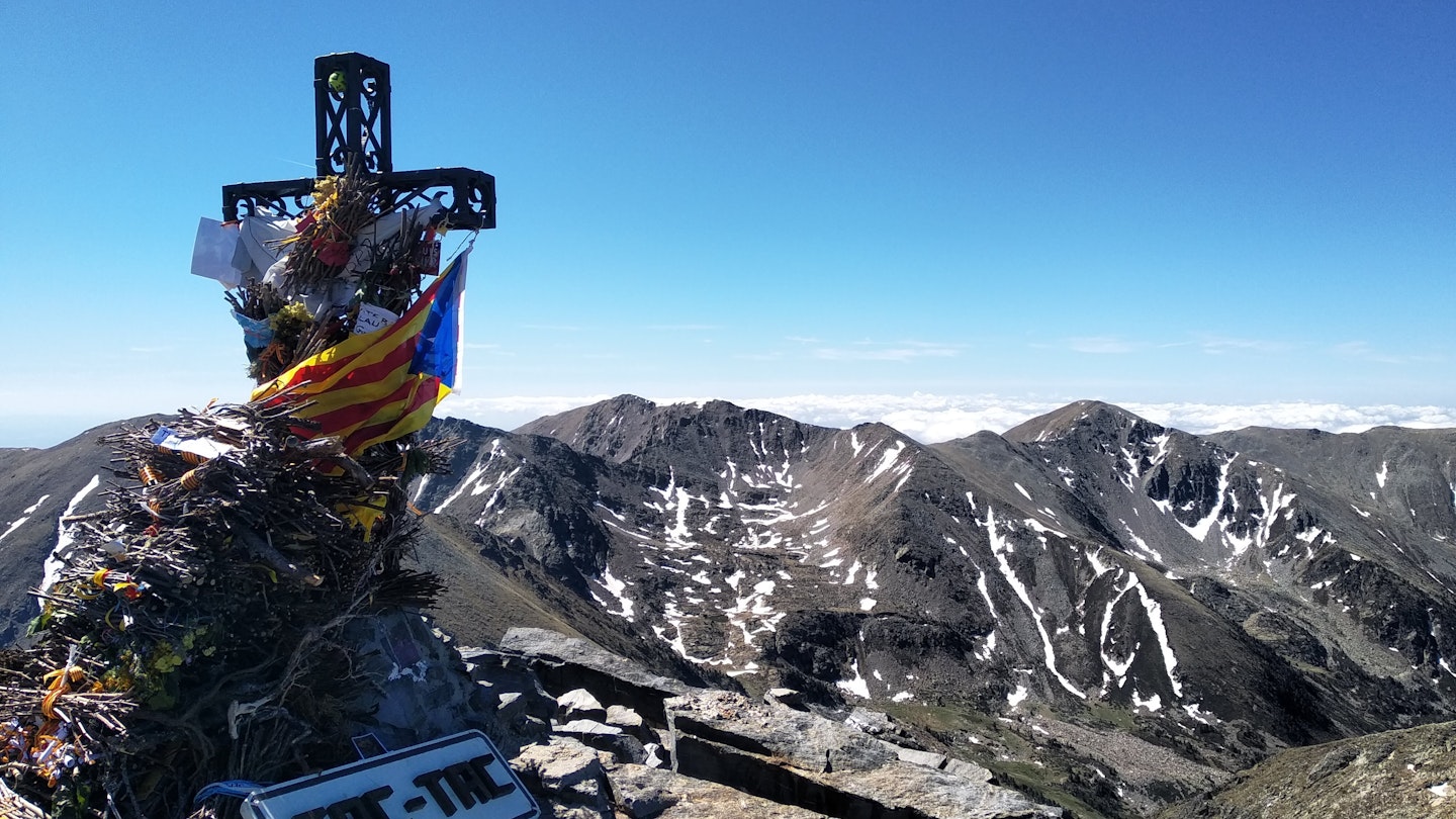 At the summit, a breathtaking 360-degree view of the entire range unfolds. This mountain holds significant cultural importance for the Catalan people, marked by a striking metal crucifix that stands guard throughout the year. During our visit, a pyre was being constructed with logs collected by hikers, destined to be ignited in celebration of the St John festival on Midsummer evening (23 June). After capturing many photographs—accompanied by the faint sounds of violin music played by a patriotic day-tripper—we began our descent down a gentle slope for lunch at the next refuge.