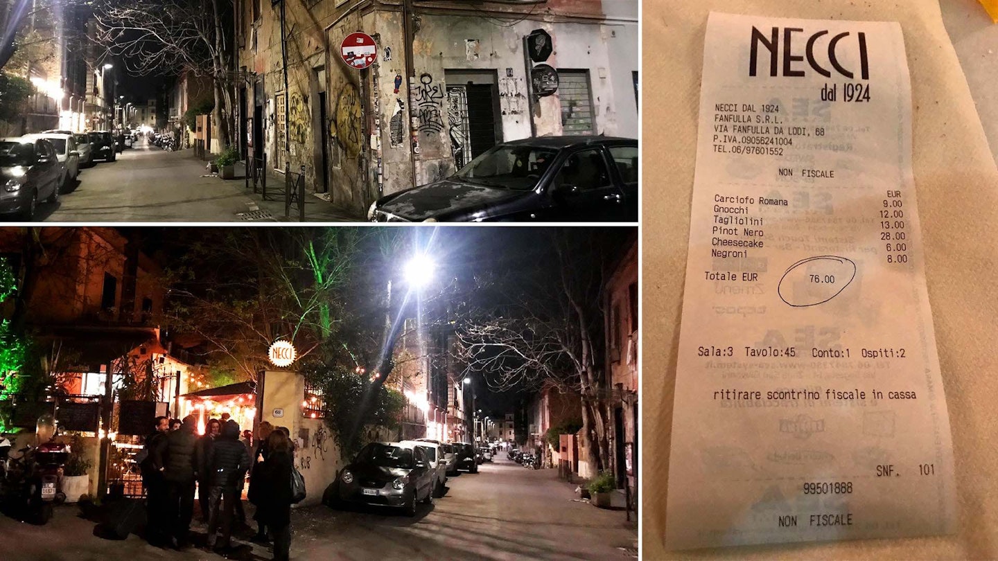 Midnight: After checking in and settling our city tourist tax of €16 for our four-night stay, we ventured out for dinner. Although it was late, Pigneto surprised us with an astonishing variety of late-night dining options. We ultimately decided on Necci dal 1941, a well-loved neighborhood spot, where we enjoyed a fried artichoke starter (€9) alongside a bottle of pinot nero (€28). I opted for gnocchi as my main dish (€12) and concluded with a cheesecake (€8) and negroni (€6) for dessert.