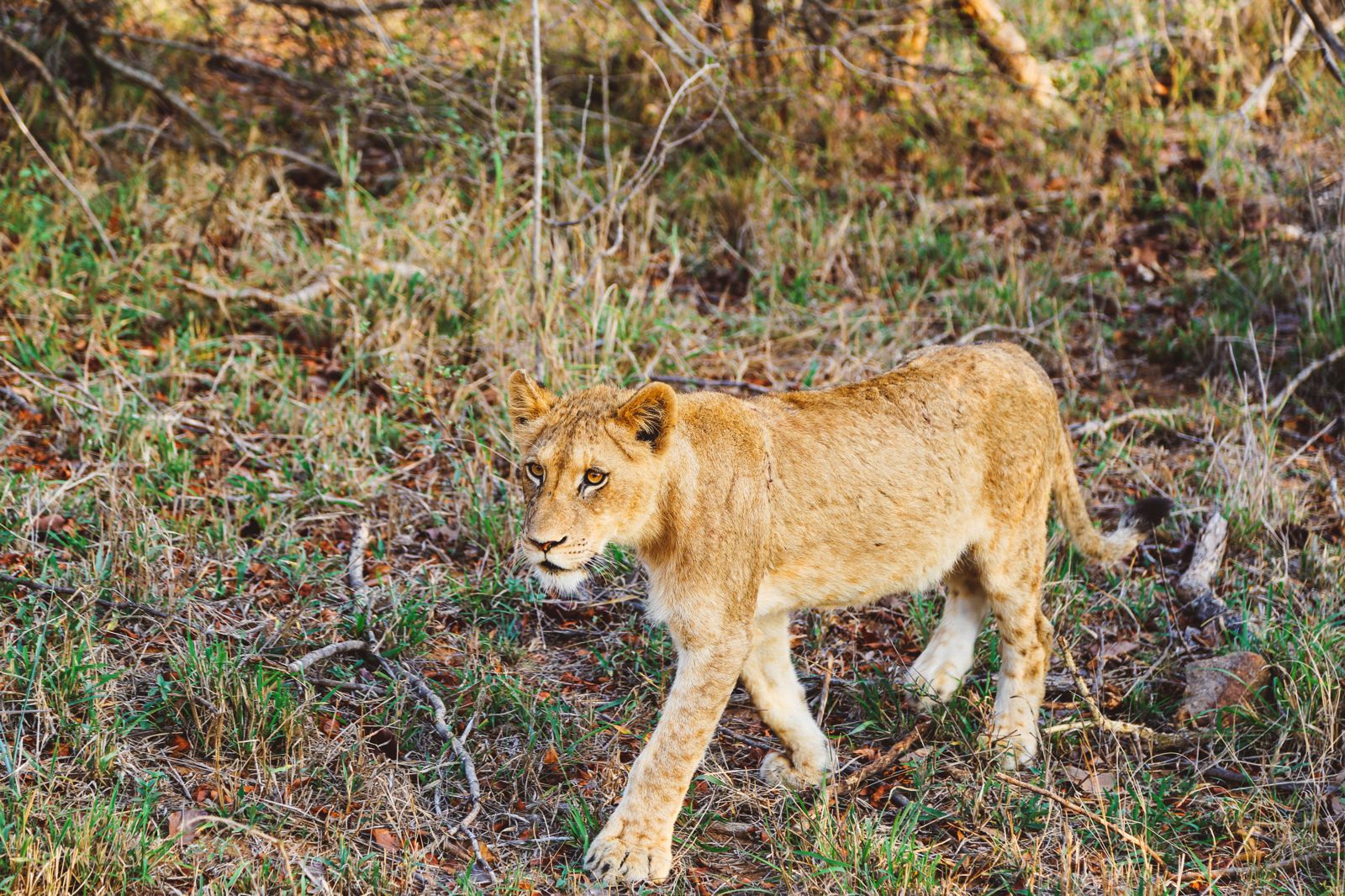 Within moments of departing the lodge, we detected movement in the underbrush. To our delight, it was a lioness stealthily navigating through the foliage.