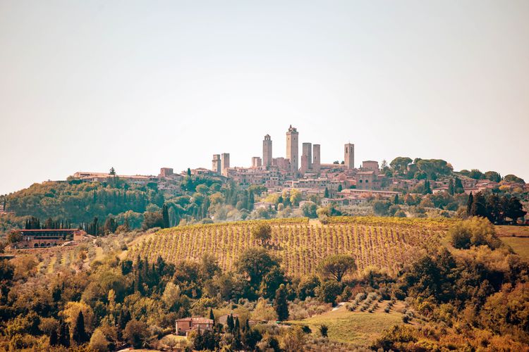 San Gimignano, known as the City of Beautiful Towers, is a classic medieval walled hill town in Tuscany. Its 14 surviving medieval towers create a beautiful skyline visible from the surrounding countryside. The historic center is a UNESCO world heritage site for its architecture. During the middle ages, the town was an important center for trade and for pilgrims traveling to or from Rome on the Via Francigena.
