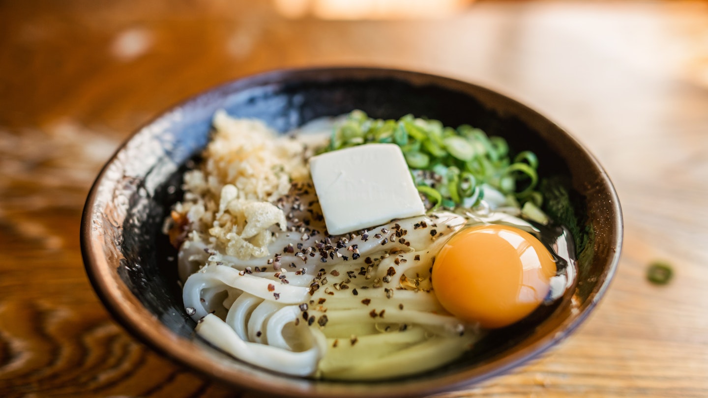 Crack! I watch my youngest son open a raw egg into a small bowl. He beats the egg with his chopsticks and then pours it over the noodles, sprinkling green onions on top. Not bad for an 8-year-old. He slurps down some noodles, looking up only to smile. Sanuki udon is served in a handful of ways. This style is kamatama udon, with kama short for kamaage or “just from the boiling pot” and tama short for tamago or “egg.” This style is so popular in Kagawa that Takamatsu’s professional soccer team is called Kamatamare Sanuki and features a bowl of noodles on its crest.
