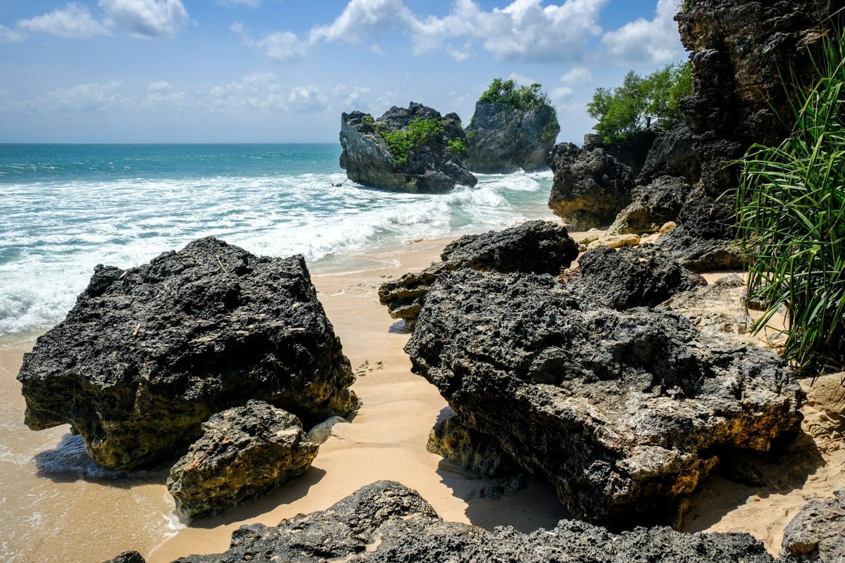 One of Bali’s hidden gems and a personal favorite, Thomas Beach is characterized by its extensive stretch of white sand interspersed with boulders and fewer crowds.