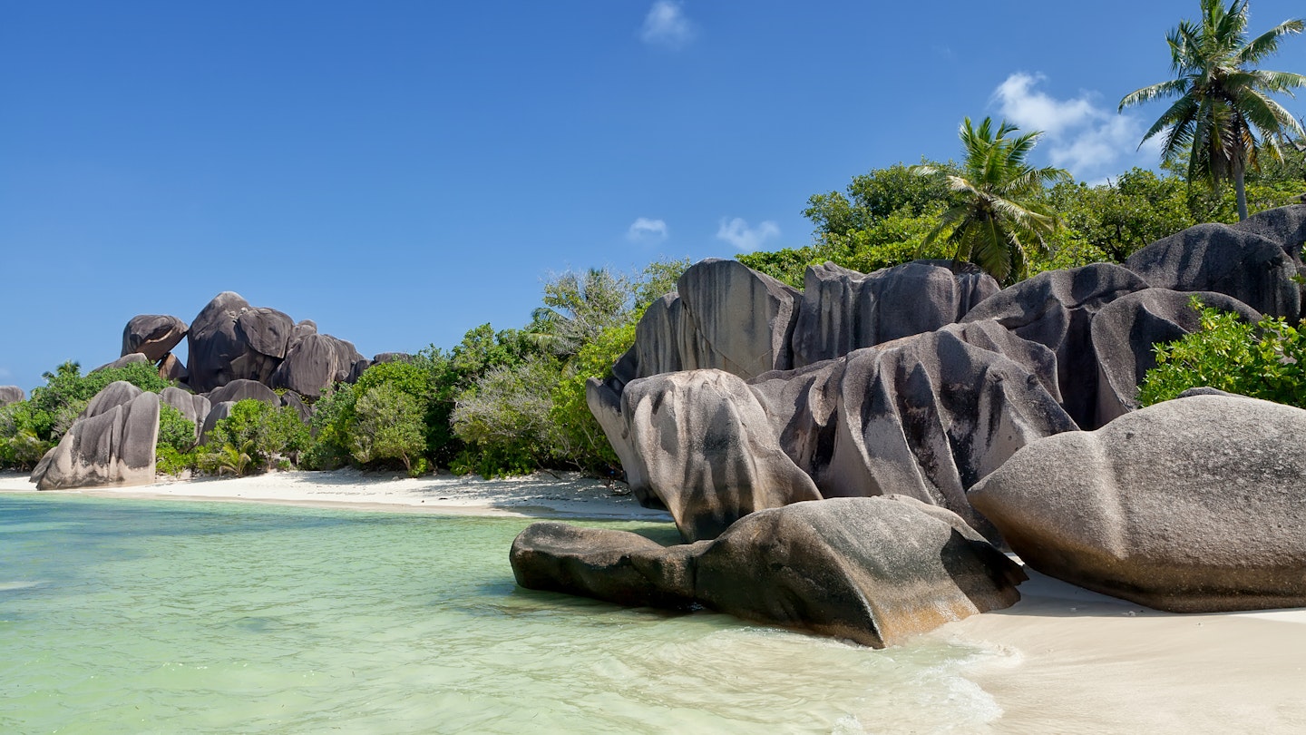 Enormous, crenellated granite boulders blanket the edge of this powdered sugar-sand beach on the southwest coast of La Digue, resembling ancient guardians of the shore. The rocks create a dramatic ambiance for beachgoers, who can snorkel in the warm, shallow waters while searching for sea turtles or avoiding sea urchins. After a swim, luxuriate on the soft sand with a fresh coconut and gaze at the emerald hills of nearby Praslin Island. Visiting at low tide is recommended, as high waters can wash the beach away.