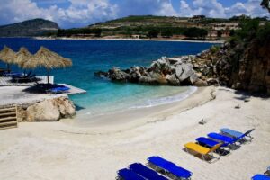 Opposite the Greek island of Corfu, Saranda (Albania) represents a quintessential Mediterranean destination, characterized by five months of warm weather and a selection of idyllic beaches along its coastline. A typical scene around Saranda features a pebbly bay embraced by clear turquoise waters and overlooked by limestone hills adorned with fragrant scrub and olive trees. Visitors can choose between popular resorts offering family-friendly activities or secluded beaches nestled within natural reserves. Furthermore, if relaxation by the sea is not sufficient, one can explore charming seaside villages, significant natural landmarks, and, notably, Butrint, a UNESCO-listed archaeological park.