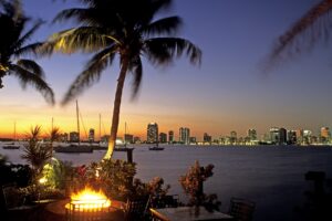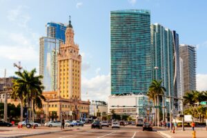 Miami, situated in Florida, boasts a breathtaking downtown area. Downtown Miami features an Atlantic Ocean waterfront adorned with marinas and both natural and artificial offshore islands, accompanied by architecturally striking high-rise towers and occasional palm trees.