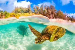 There’s nothing like diving into the crystal clear waters of Hawaii in search of colorful tropical fish and exotic ocean wildlife. The islands are home to honu (green sea turtles), he’e (octopus), nai’a (dolphins), and even majestic humpback whales during the winter months. If you’re lucky, you might even spot the Hawaii state fish, humuhumunukunukuapua’a (reef triggerfish). Especially during the summer months, Oahu’s waters are warm and inviting for snorkelers — that means you won’t need a wetsuit, and don’t forget the reef-safe sunscreen! Whether you’re enjoying the Pacific Ocean from the shore or jumping off a catamaran, the snorkeling on Oahu is some of the best in the world.