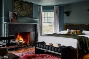 The sun was just beginning its gradual slide toward the horizon as my sister and I sat, glasses of pinot grigio in hand, by the fire pit of theCliffside Inn, aLark Hotelin Newport, Rhode Island. Although we arrived later than anticipated and missed the afternoon wine service, the accommodating innkeeper set us up with a drink, sensing our road fatigue. We sank into the cushioned wicker chairs, sipping and conversing until the firelight cast flickering shadows around us, illuminated by a pink crescent moon that highlighted the grand silhouette of the beautifully restored Victorian mansion.