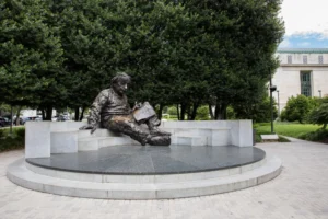 The memorial to Albert Einstein is set at the entrance to the headquarters of the National Academy of Sciences, a private, non-profit society of distinguished scholars, in Washington DC. The memorial offers an intimate experience, allowing visitors to get up close and take memorable photographs (children can even sit in his lap). Built in 1979 to honor the centennial of Einstein’s birth, this impressive 12-foot bronze figure depicts him seated on a granite bench, holding a paper filled with mathematical equations summarizing three of his pivotal scientific achievements: the photoelectric effect, the theory of general relativity, and the equivalence of energy and matter.