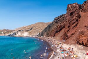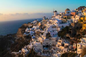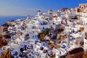 The Greek island of Santorini is a favored vacation destination within the Cyclades archipelago.