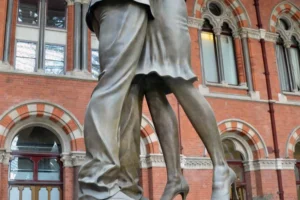 The Meeting Place, located at St Pancras International train station, is not merely a designated spot for meeting friends; it stands as a striking 9-meter tall bronze statue depicting a man and woman in an intimate embrace. Designed by Paul Day, this monumental sculpture was unveiled in 2007 and has become a significant focal point amid the bustling activities of the station.