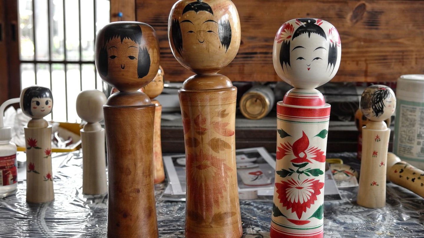 Kokeshi are simple, limbless wooden dolls decorated with various patterns, including chrysanthemums, plum blossoms, and stripes. They have traditionally been made in remote hot-spring villages, such as Tsuchiyu Onsen in Fukushima Prefecture, and Shiroishi and Zao in Miyagi Prefecture, where they have been produced since the Edo period (1608–1868). As with many folk toys, kokeshi were historically crafted by farmers during the long winters to supplement their income. Originally for children, the dolls are now admired as elegant design pieces.