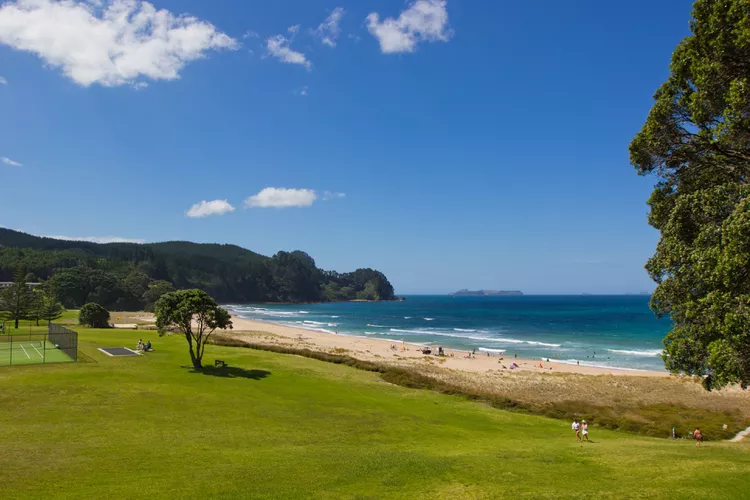 Sunny day on a New Zealand beach with white sand, fresh green juicy grass and turquoise color ocean under the blue sky gotraveldaily