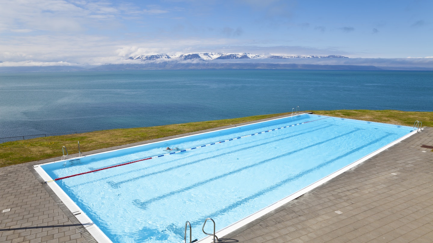 Klébergslaug in the village of Kjalarnes serves as a miniature example of what nearly every pool in the country has to offer. In addition to a swimming pool, just 17 meters long, it features multilevel hot tubs for relaxation and a small waterslide for adventurous visitors.