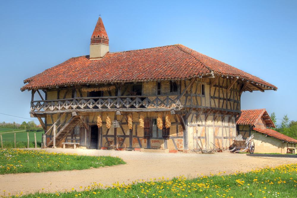 A classic Bresse farmhouse features half-timbering, with ears of corn hanging from the porch.
