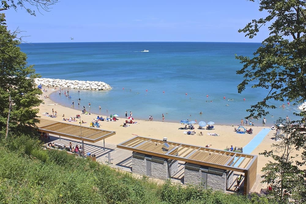 Situated at the base of wooded bluffs and connected by a boardwalk, Rosewood Beach offers a wonderful location for relaxation by Lake Michigan during the summer. It is a pride of the Park District of Highland Park.