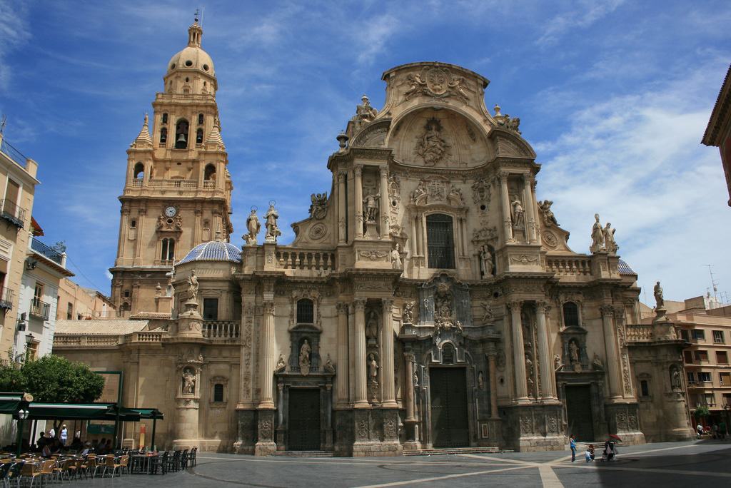 The principal Baroque facade on Plaza del Cardenal Belluga is impressively grand, characterized by bold columns and a beautiful sculpture of the Virgin Mary with an archangel positioned above the main entrance.