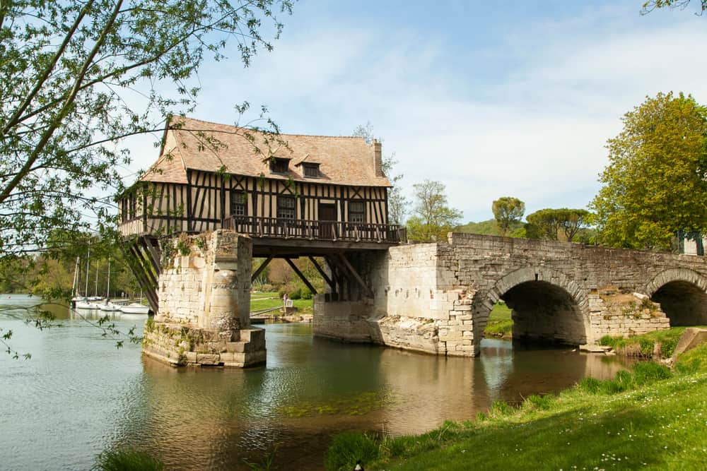 The Old Mill is a 14th-century timber building perched on two piers, remnants of a medieval bridge that once linked Vernon to Vernonet.