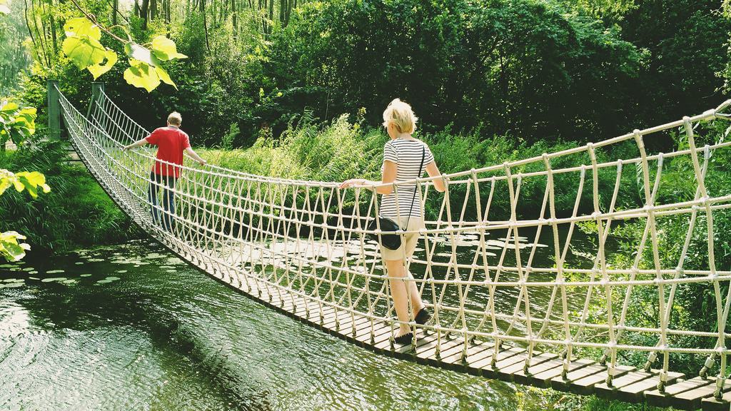 The park features wooded areas, reed beds, numerous playgrounds, and various waterways accentuated by charming bridge crossings.