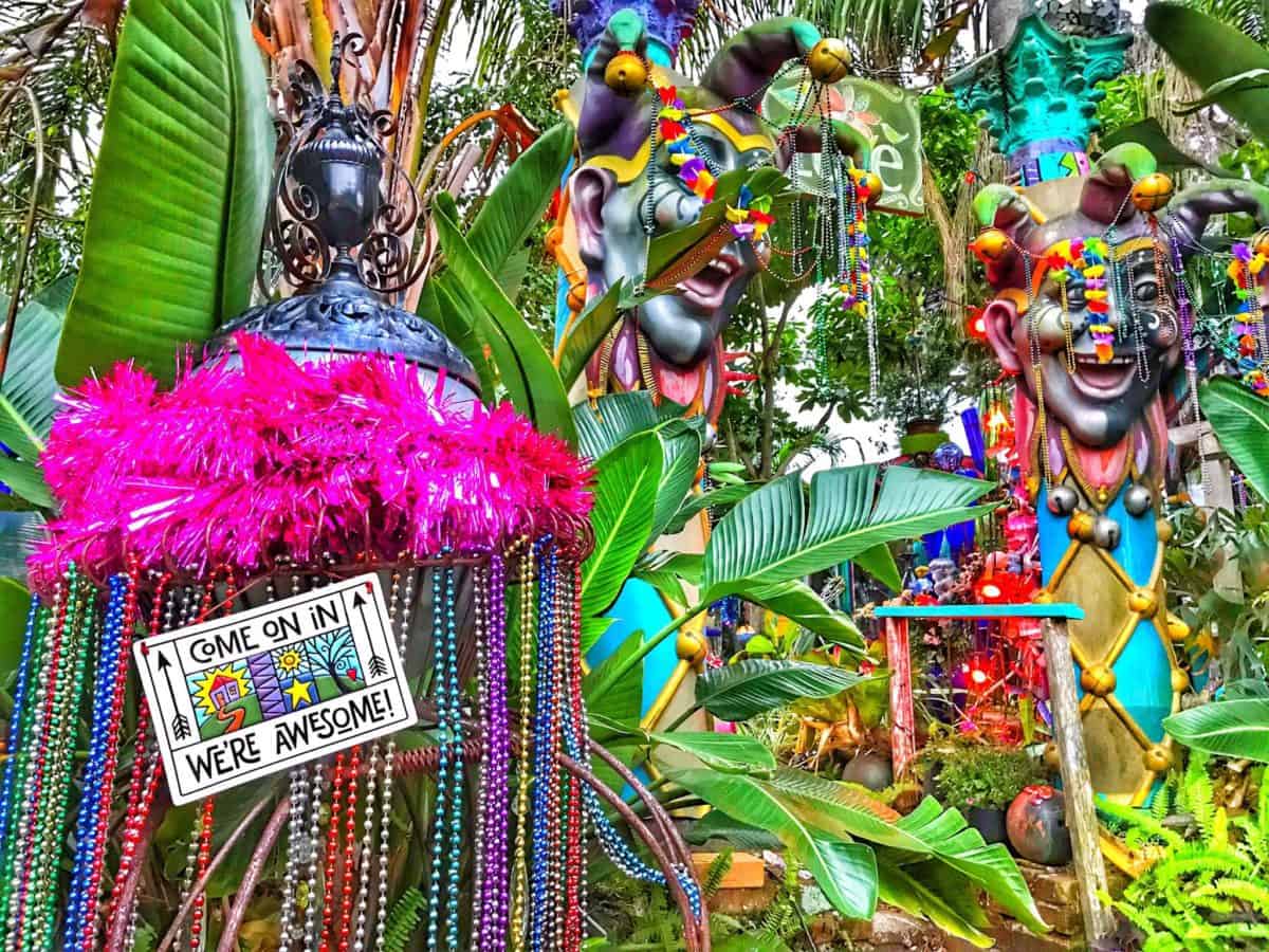 As time progressed, folk artists from various locations began visiting, bringing painted bowling balls as gifts. Presently, the installation comprises over 80 bowling balls, and the vibrant colors and textures create an ambiance reminiscent of year-round Mardi Gras.