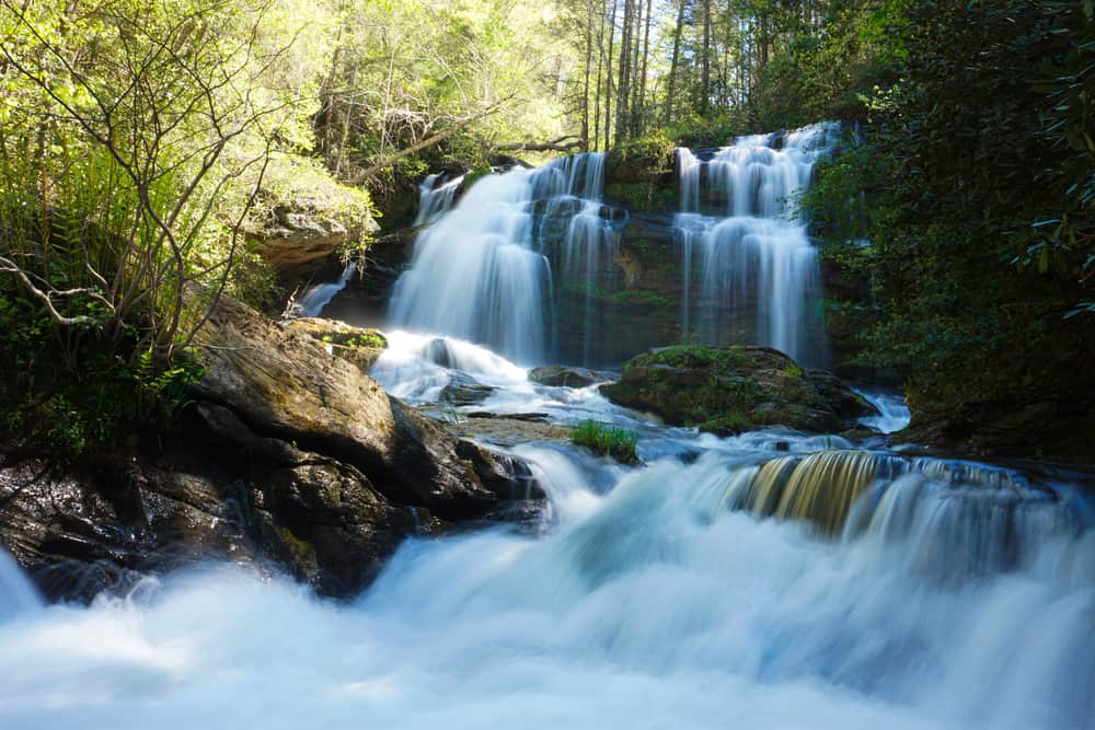 Situated near the Chattooga River along the Georgia border, these falls are taller, reaching 70 feet.
