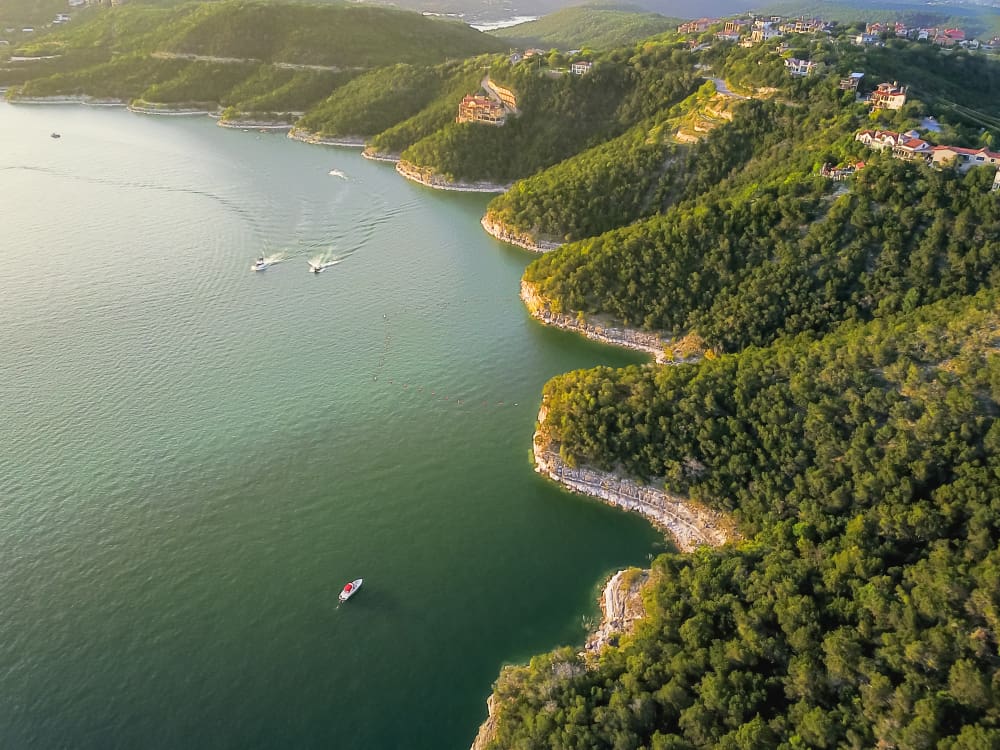 The shoreline consists of over 400 kilometers, offering ample camping and picnicking areas. Hippie Hollow Park, located here, is well-known among nudists. Additionally, the LGBTQ+ community organizes annual Splash Day events at the park.