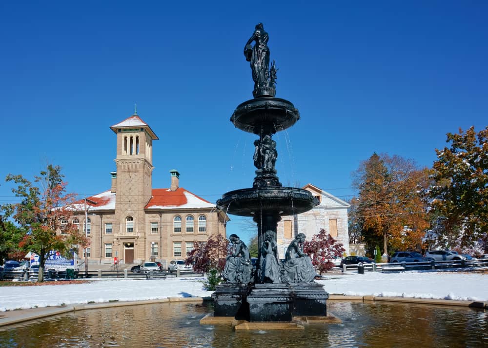 The park’s centerpiece is the elegant Foster Fountain, presented to Clinton in 1890 by affluent resident John R. Foster, known for his chain of clothing stores across New England.