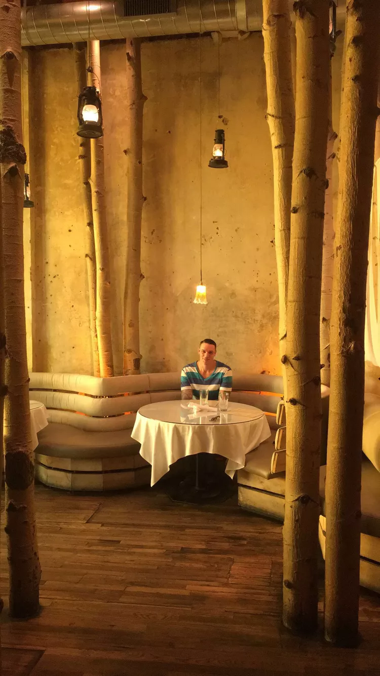 B&W is adorned from ceiling to floor with real, reclaimed aspen trees. These trees frame the walls, setting the backdrop for cozy dining nooks and enhance the overall decor throughout the restaurant. The yellow-tinted front window makes the venue stand out, and inside, this subtle hue creates an ambiance reminiscent of sitting within a grove of trees at sunset.