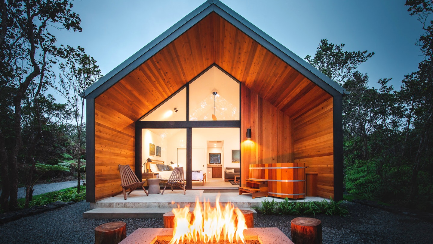 Minutes from Volcano Village and Hawai’i Volcanoes National Park on the Big Island, the modern Kūono cabin features minimalist decor and contemporary furnishings, offering luxe amenities like a 4K TV and Bose Bluetooth speakers. The stunning open-plan interior is complemented by an impressive outdoor living space, complete with a private lanai, a switch-operated fire pit, and a hot tub just steps from the front door. Surrounded by Ohia trees and minimal light pollution overhead, it’s the perfect spot to unwind. $350 per night.