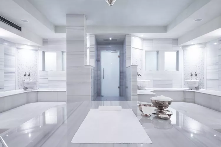 Inside, it features a five-star, 9,000 square foot, three-story wellness center. Adorned with marble and mosaics, it epitomizes opulence. Guests can indulge in men’s and women’s saunas, whirlpool services, and specialized wellness treatments here.