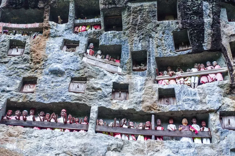 In the town of Lemo, a sheer cliff stands honeycombed with hand-carved crypts called liang patane, their doors measuring about five feet square and opening into small spaces that fit four or five coffin-less remains. Liang patane are designed to accommodate entire families and are guarded by tau-tau, or effigies, depicting the persons entombed behind them.