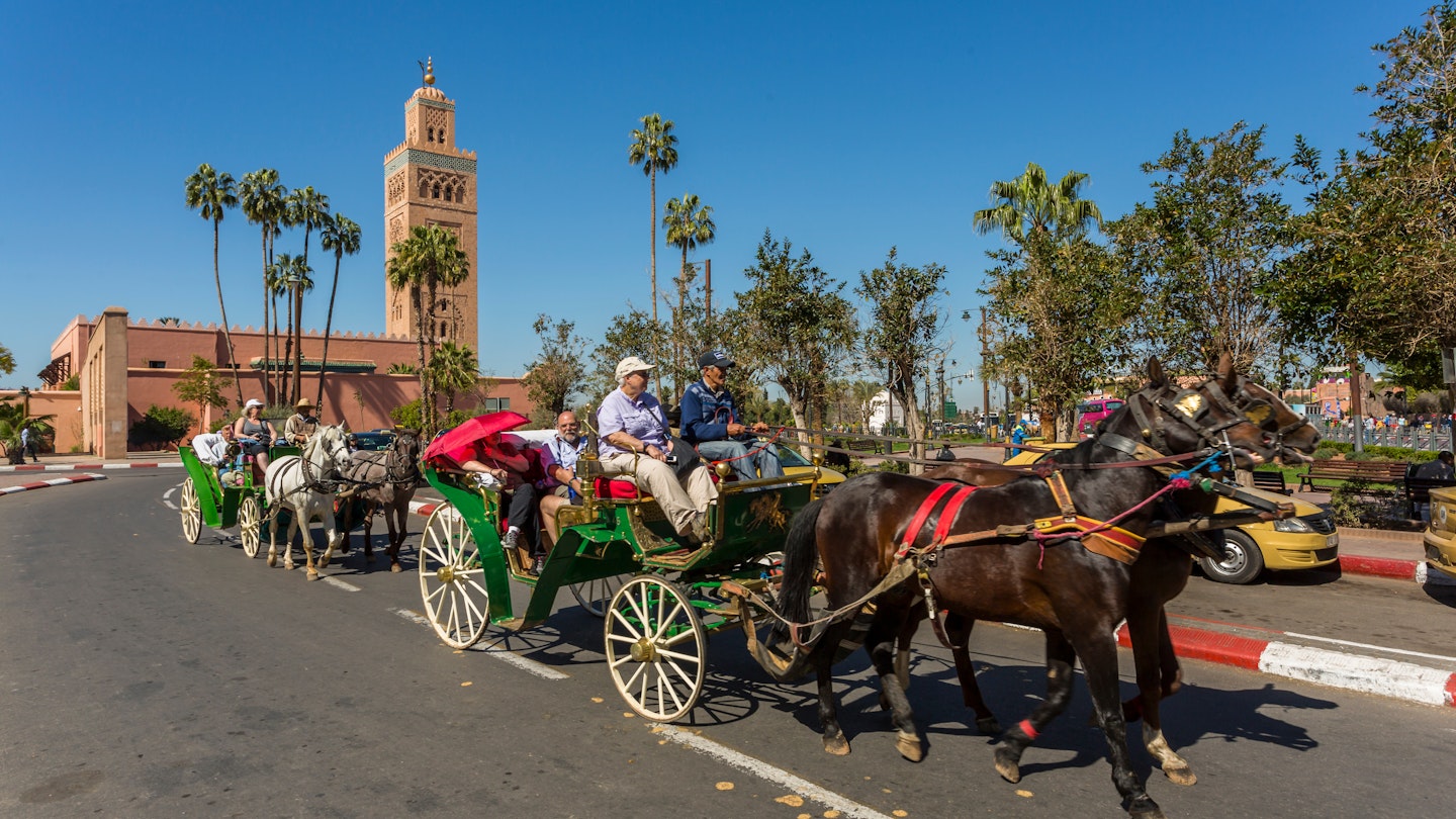 The green carriages congregate between Djemaa El Fna and Koutoubia Mosque and around Jardin Majorelle. Ensure to check for a SPANA tag on your horse, as this animal welfare organization microchips the horses to guarantee their well-being and has established water troughs throughout the city.