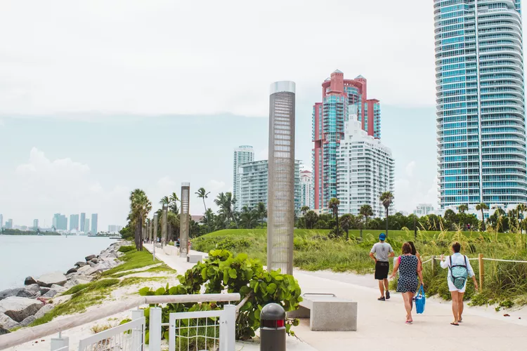 Imagine a city park adorned with trees, walking paths, and benches. Now, envision a beach right beside this oasis, and you’ve discovered South Pointe. This expansive 17-acre park in Miami Beach serves as a serene retreat, perfect for unwinding after a day at South Beach or simply enjoying a day outdoors.