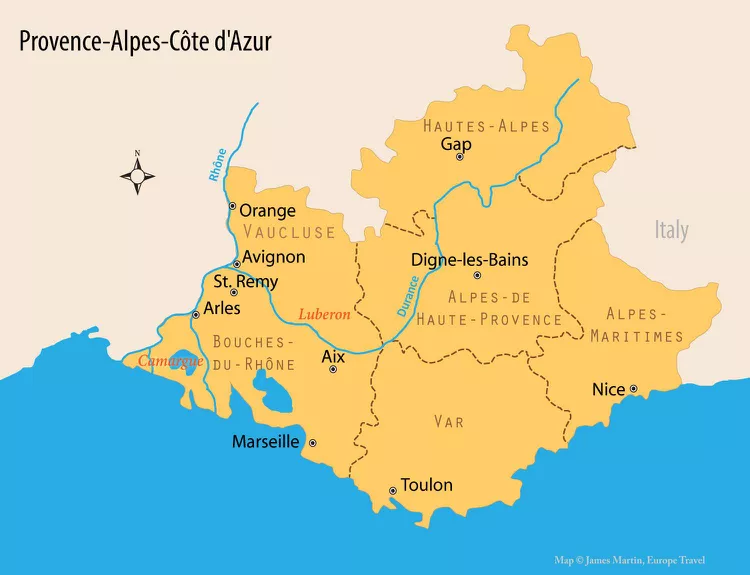 The modern Provence-Alpes-Côte d’Azur is divided into six departments: Bouches du Rhone, Var, Alpes Maritimes, Vaucluse, Alpes de Haute Provence, and Hautes Alpes. However, traditional Provence is slightly smaller. To reach it, one must exclude the Hautes Alpes, the northern part of Vaucluse above the Luberon, and the portion of Alpes-Maritimes east of Nice.