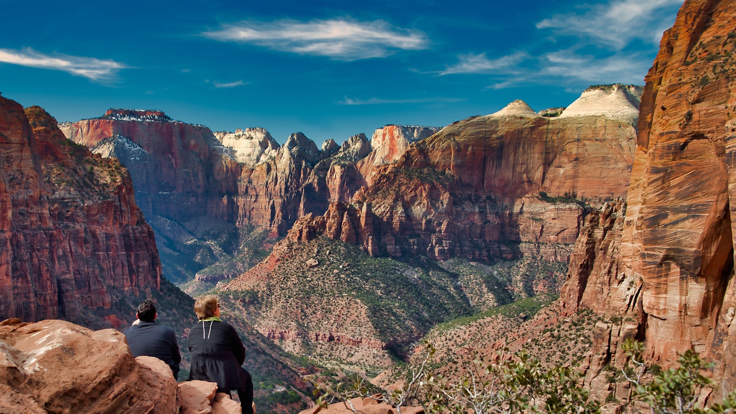 The towering red and white cliffs of Zion Canyon, a prominent natural wonder, loom high over the Virgin River, a portrayal of its original name, Mukuntuweap, which means “straight canyon.” Mormon settlers rechristened it Zion, an ancient Hebrew word meaning “sanctuary.”