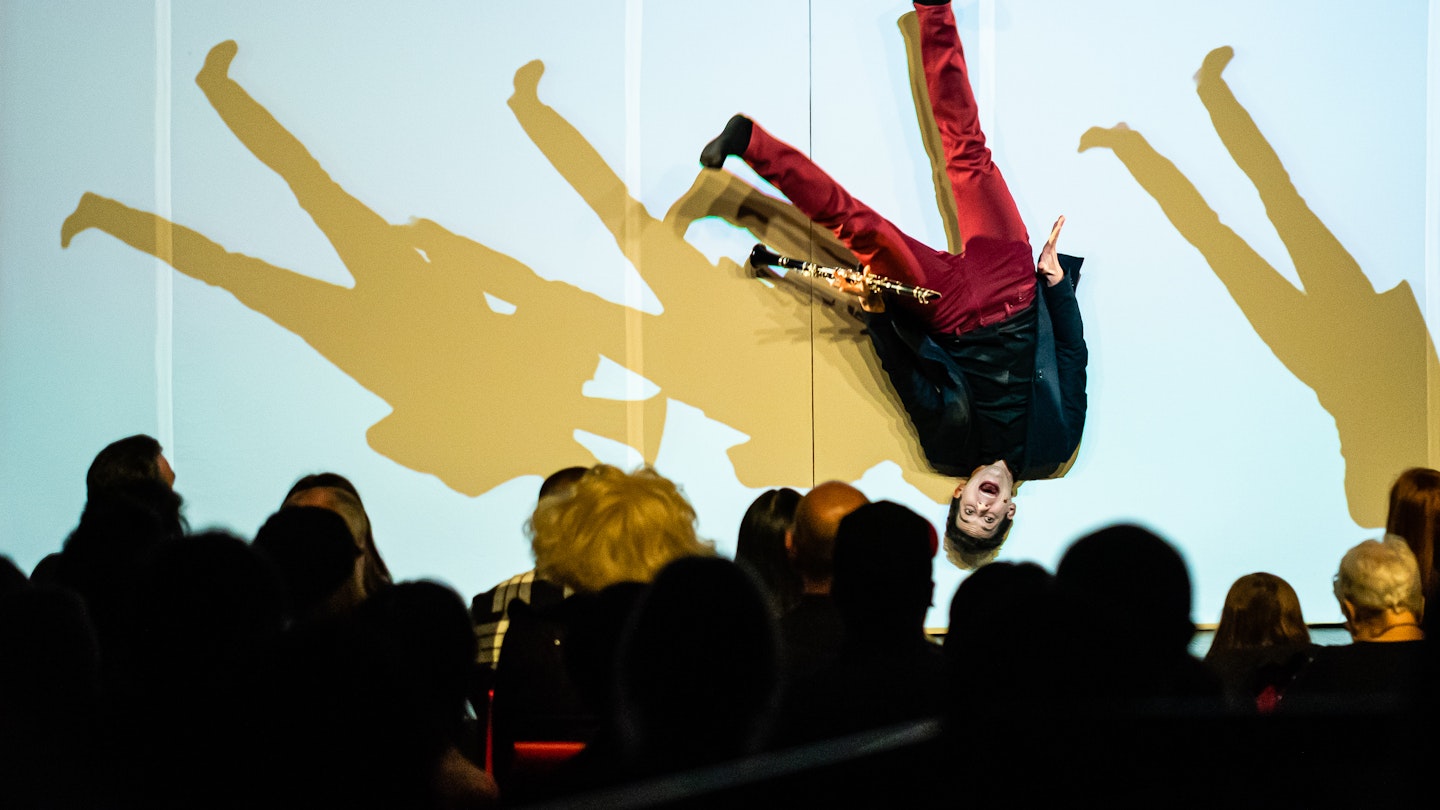 A native of France who made a reputation in Paris performing mime, Mortimer still incorporates mime and other talents that are particularly popular in Europe. His mastery is evident when he actually plays a clarinet, while spinning upside-down, with other musicians in his “shadow orchestra.” It’s a stunning bit of showmanship that has to be seen to be appreciated.