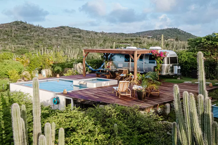 One of the most inviting roosts on this diminutive Dutch Caribbean island isn’t on popular Palm or Eagle beaches; in fact, it isn’t on the beach at all. The first of its kind in the region, Aruba Airstream is an oasis for travelers in search of seclusion, hitched in the midst of the cacti-studded cunucu (“desert” or “outback”). Up to four guests can settle into the gleaming (and blissfully air-conditioned) 30-foot Flying Cloud model, which sits next to its own saltwater pool, hot tub, and outdoor shower. The owners go the extra mile by providing restaurant and day-trip recommendations, and they have stocked the space with exercise equipment and a telescope for stargazing. You’ll probably want to rent a car to experience Aruba’s island attractions and beaches—all of which are within a 20-minute drive—but swinging in the hammock as iridescent lizards skitter across the breezy pool deck is an equally appealing proposition.