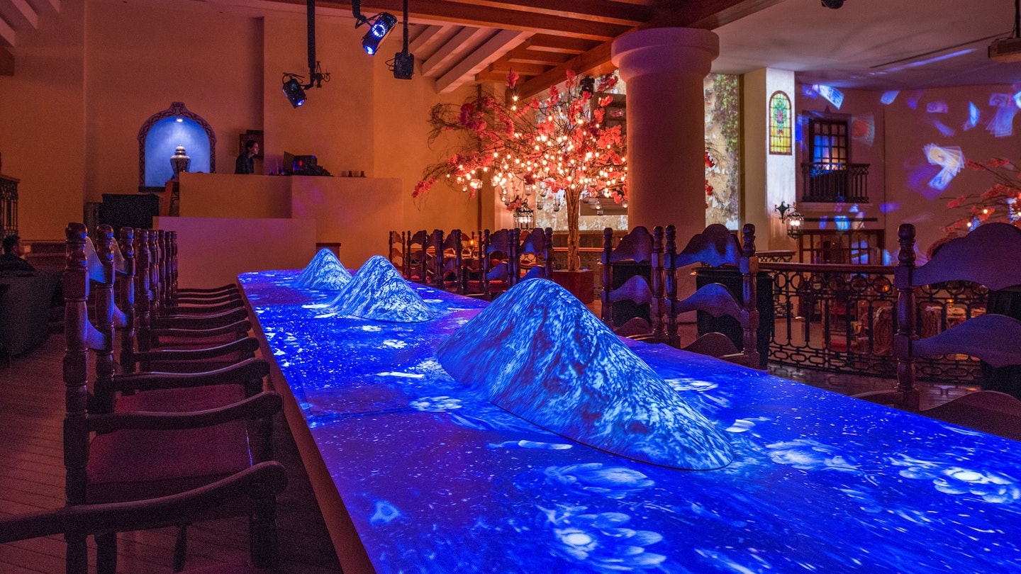 This multi-sensory culinary adventure combines music and narration for a truly unique dining experience. A 16-person table comes alive with images of fiery volcanoes and churning lava, depicting the beginning of civilization on the Yucatán Peninsula.