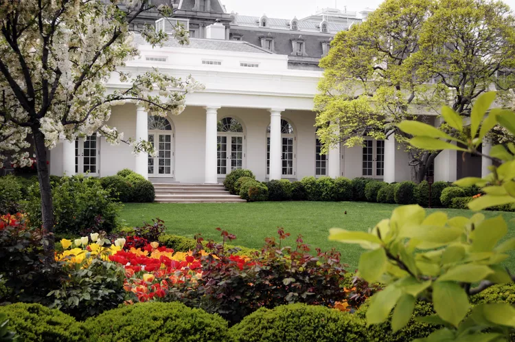 The grounds surrounding the White House are beautifully landscaped, featuring vibrant flowers such as tulips, hyacinths, and chrysanthemums in the East Garden.